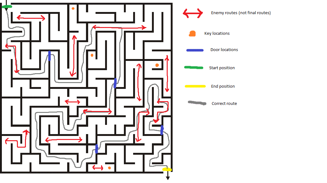 Right now a cube object is used to perform A.I. behaviour, enemy cube can move around using by using the NavMesh which accesses a simpleEnemy script. The enemy script is basic which has an enumerator which switches states from Attack and Chase. There are two enemies simple and advanced, below shows a map how they operate with red lines as routes. Focusing on simple enemy right now!